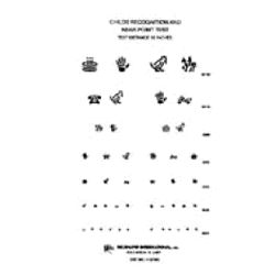 Symbols easily recognizable by children such as a hand, birthday cake, horse with rider, bird, telephone and truck are illustrated in these pediatric near point and distance charts. Image sizes representing 20/180 down to 20/20 are illustrated on 7 lines. For use at 16 inches. Size is 5 ½" 8 inches.