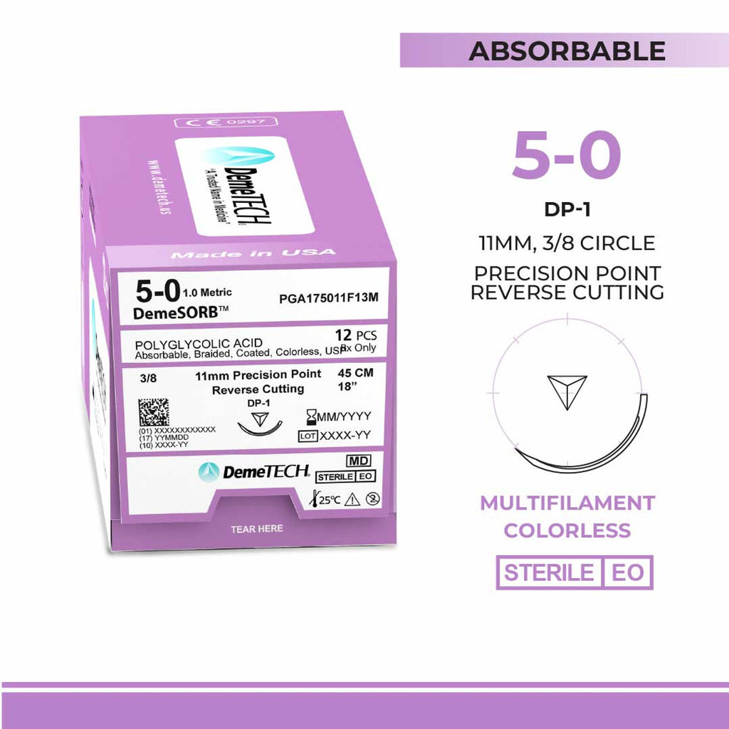 Polyglycolic Acid (PGA), 5-0, 18", DP-1 Synthetic Absorbable Suture, Precision Point Reverse Cutting, Undyed 12/Box